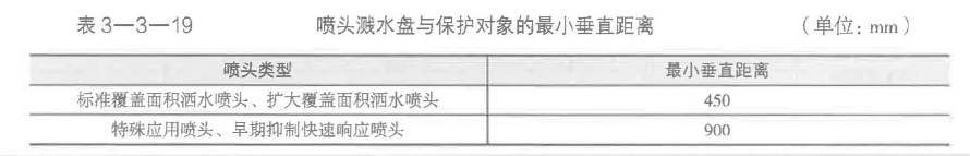 (6)圖書館、檔案館、商場(chǎng)、倉(cāng)庫(kù)中通道上方灑水噴頭的布置。圖書館、檔案館、商場(chǎng)、倉(cāng)庫(kù)中的通道上方宜設(shè)有噴頭。噴頭與被保護(hù)對(duì)象的水平距離不應(yīng)小于0.30m,噴頭濺水盤與保護(hù)對(duì)象的最小垂直距離不應(yīng)小于表3-3-19的規(guī)定。