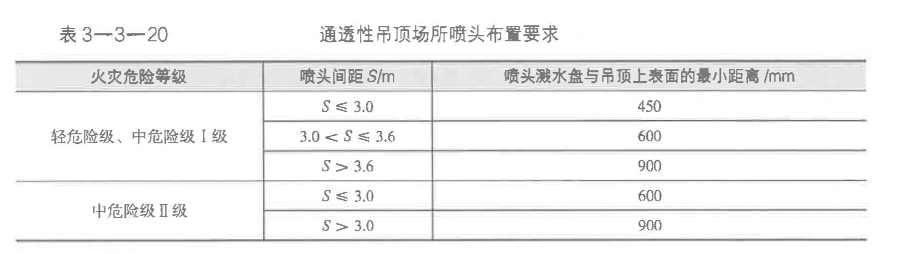 (8)通透性吊頂場(chǎng)所灑水噴頭的布置。裝設(shè)網(wǎng)格、柵板類通透性吊頂?shù)膱?chǎng)所,當(dāng)通透面積占吊頂總面積的比例大于70%時(shí),噴頭應(yīng)設(shè)置在吊頂上方,且通透性吊頂開口部位的凈寬度不應(yīng)小子10mm,開口部位的厚度不應(yīng)大于開口的最小寬度,噴頭間距及i賤水盤與吊頂上表面的距離應(yīng)符合表3-3-20的規(guī)定。