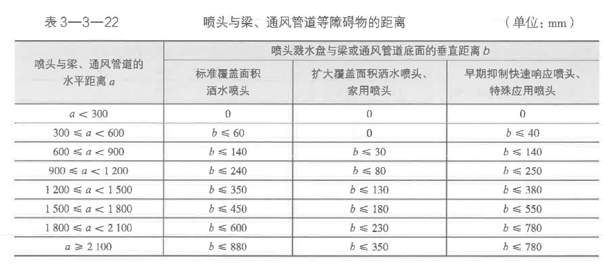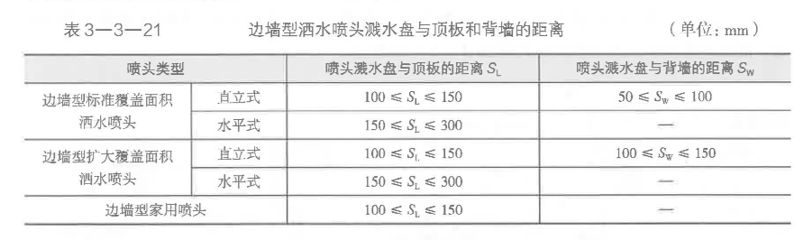 (12)邊墻型灑水噴頭濺水盤與頂板和背墻的距離。采用邊墻型灑水噴頭時(shí),其濺水盤與頂板和背墻的距離應(yīng)符合表3-3-21的規(guī)定。