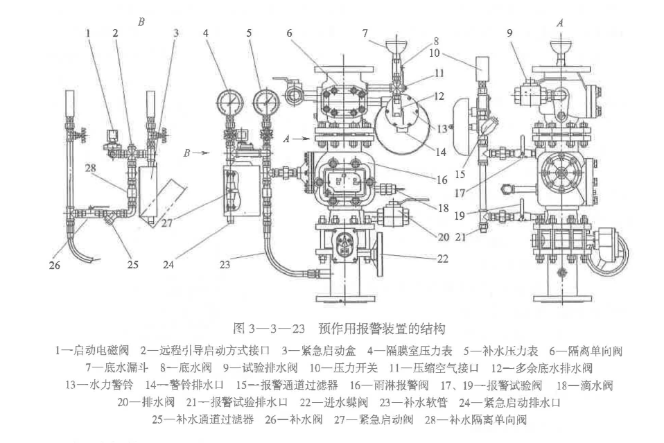 (1)雨淋報(bào)警閥組的組成。雨淋報(bào)警間是通過電動(dòng)、機(jī)械或其他方式開啟,使水能夠自動(dòng)流入噴水滅火系統(tǒng)并同時(shí)進(jìn)行報(bào)警的一種單向閥。其按照結(jié)構(gòu)可分為隔膜式、推桿式、活塞式、蝶閥式雨淋報(bào)警閥。雨淋報(bào)警閥廣泛應(yīng)用于雨淋系統(tǒng)、71<.幕系統(tǒng)、水霧系統(tǒng)、泡沫系統(tǒng)等各類開式自動(dòng)噴水滅火系統(tǒng)中。雨淋報(bào)警閥組的組成如圖3-3-21所示。