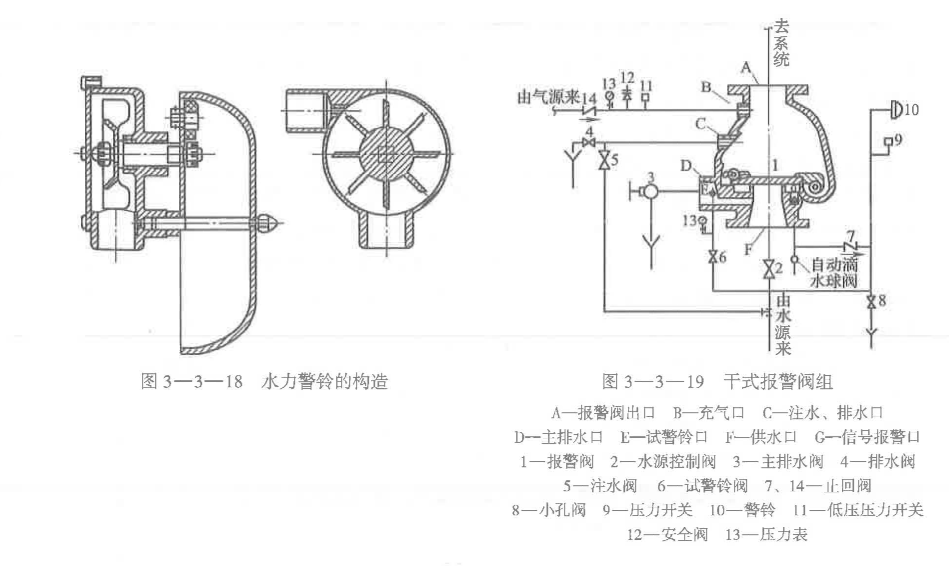 (1)干式報(bào)警閥組的組成。干式報(bào)警閥組主要由干式報(bào)警閥、水力瞥鈴、壓力開關(guān)、空壓機(jī)、安全閥、控制閥等組成,如圖3-3-19所示。報(bào)警閥的閥瓣將閥門分成兩部分,出口側(cè)與系統(tǒng)管路相連,內(nèi)充壓縮空氣;進(jìn)口側(cè)與水源相連,配水管道中的氣壓抵住閥瓣,使配水管道始終保持干管狀態(tài),通過兩側(cè)氣壓和水壓的壓力變化控制閥瓣的封閉和開啟O噴頭開啟后,干式報(bào)警閥自動(dòng)開啟,其后續(xù)的一系列動(dòng)作類似于1顯式報(bào)警閥組。