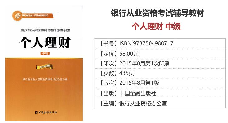 2015年版銀行業(yè)專業(yè)人員職業(yè)資格中級考試輔導教材《個人理財》主要針對商業(yè)銀行理財中心、財富管理中心、私人銀行部門的理財經理、客戶經理、投資顧問等人員或有志于從事上述崗位工作的人員設計,其內容緊扣考試大綱,涵蓋理財規(guī)劃幾大專業(yè)服務模塊和綜合理財規(guī)劃的相關知識技能。