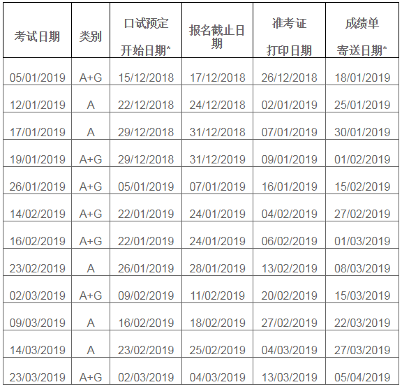 2019年1月至3月雅思考試報名截止日期、準考證打印日期和成績單寄送日期: