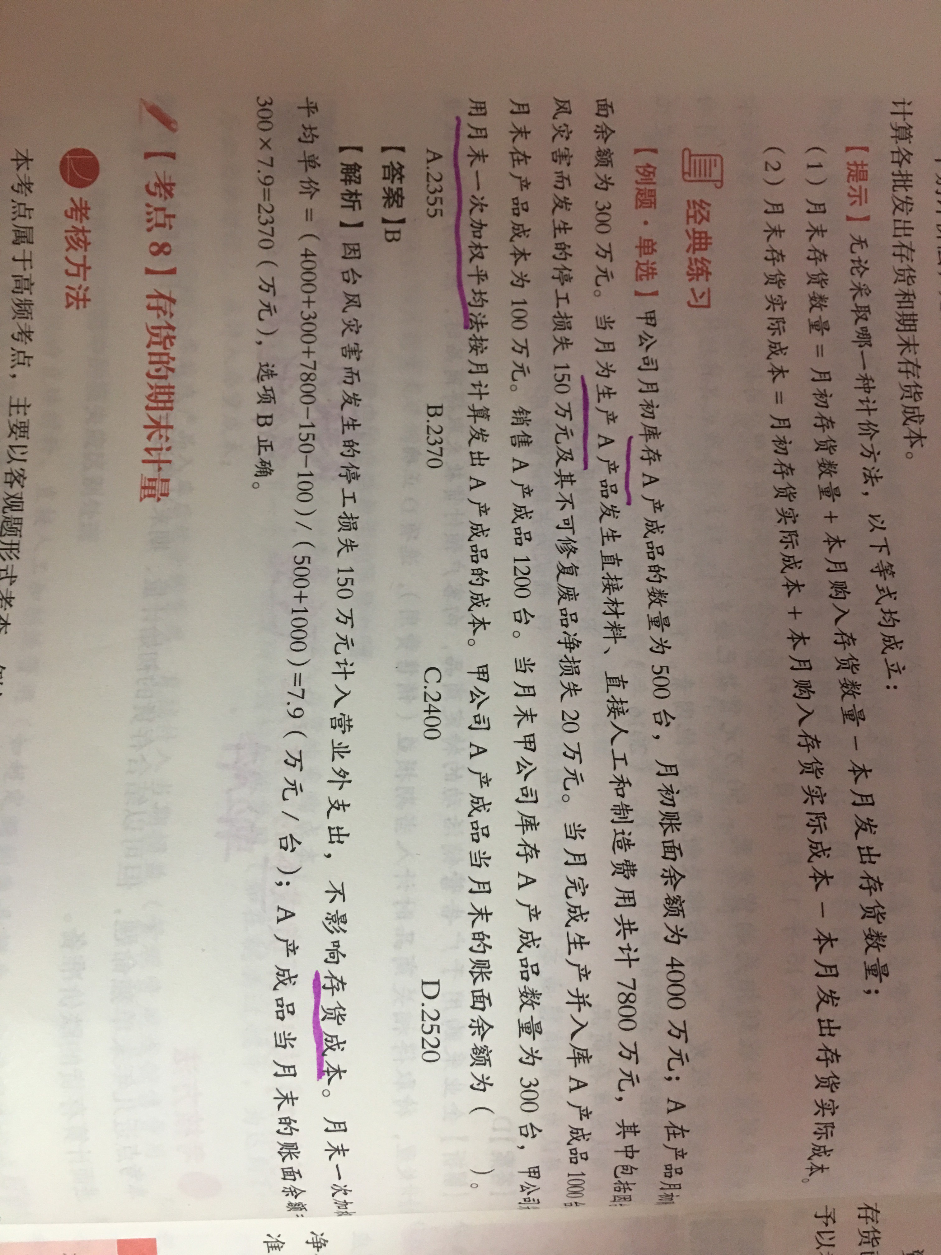 題目有點(diǎn)讀不懂,第一句話(huà),庫(kù)存A月初賬面余額4000萬(wàn)元和A在產(chǎn)品月初賬面余額有什么區(qū)別嗎?停工損失不影響存貨,計(jì)算了減去了150是為什么呢?