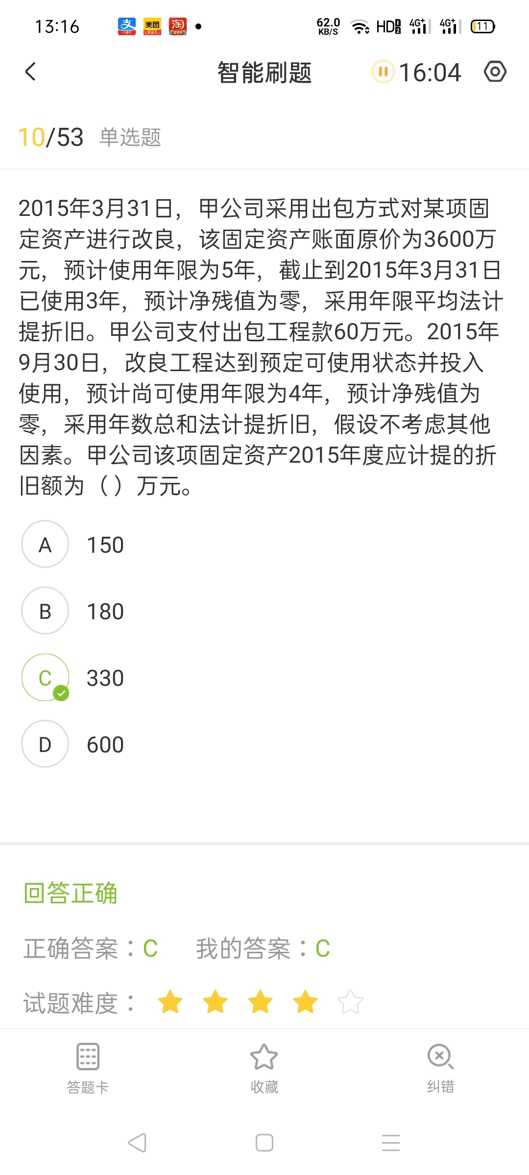 - 首先,用年折舊率(1/10)乘以資產(chǎn)原值得到年折舊額(1500×1/10=150)。