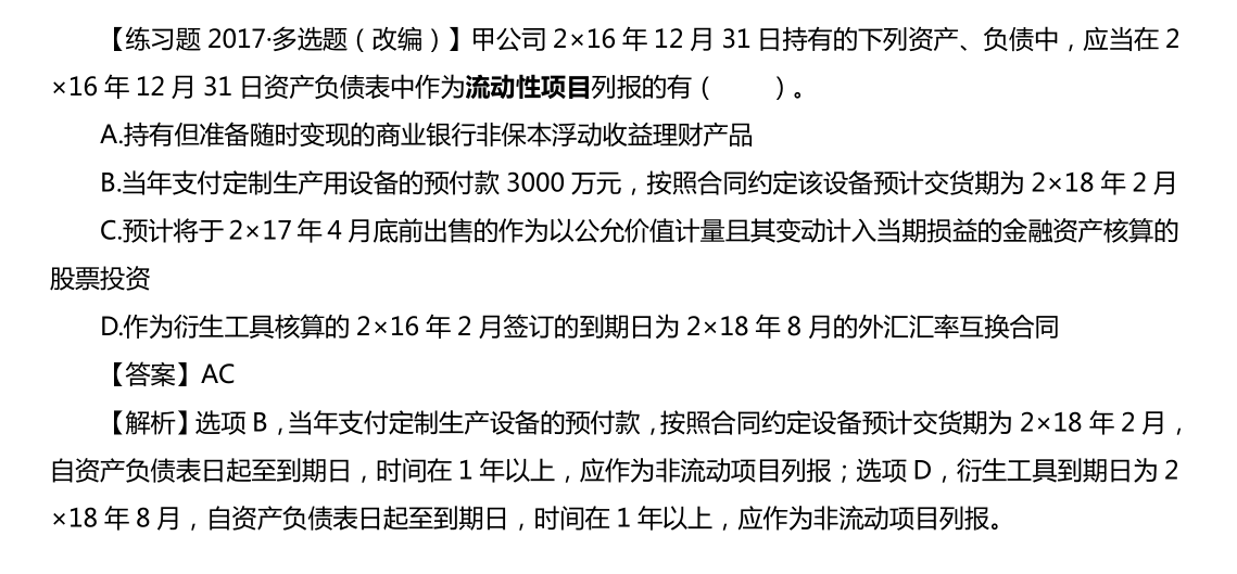 B選項(xiàng)可能指的合同資產(chǎn)并不滿足上述流動性要求,即該合同資產(chǎn)預(yù)期變現(xiàn)或消耗的時間超過一年,因此它不符合流動資產(chǎn)的定義,不能計入流動性項(xiàng)目中。