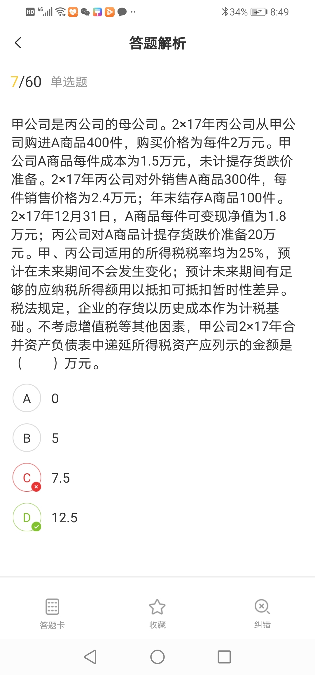 - 如果是簡單的按照減值恢復金額直接減少了稅前利潤,而沒有考慮稅法的規(guī)定,那么計算出的7.5可能是錯誤的。