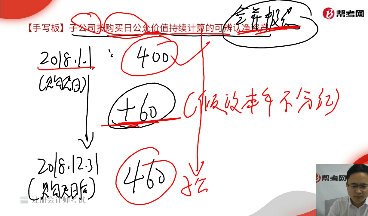 1. 子公司自身賺取60利潤(rùn),其可辨認(rèn)凈資產(chǎn)增加60,計(jì)算公式為:400(起初凈資產(chǎn))+ 60(利潤(rùn))= 460。