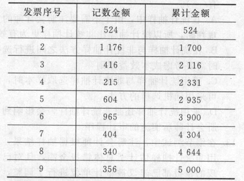2、注冊(cè)會(huì)計(jì)師欲從9張銷售發(fā)票組成的總體中選擇4張進(jìn)行測(cè)試,已知9張發(fā)票總額為5 000元,總體項(xiàng)目單位的累計(jì)金額表如下: