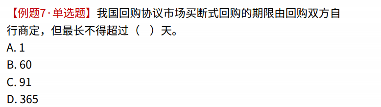 - **考題的上下文信息**:可能題目中給出了額外的信息或條件,使得D選項(可能涉及買斷式回購超過了91天或質(zhì)押式回購超過了365天)成為正確答案。